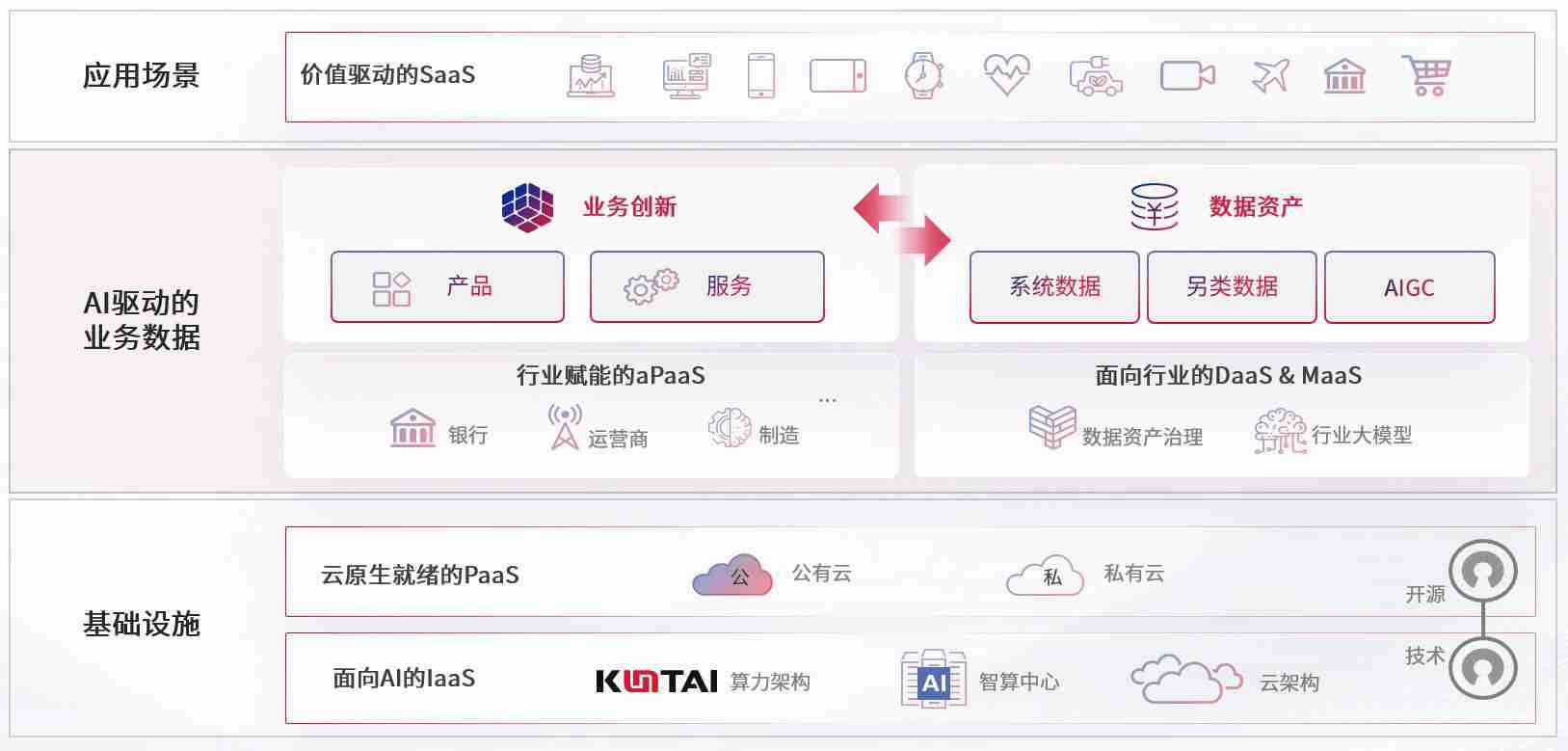 数字时代,,,围绕企业数字化转型的关键要素,,,z6com尊龙数码开创性的提出数云融合战略和技术体系框架,,,着力在云原生、、、、数字原生、、AI原生和信创产业上架构产品和服务能力,,,,为处在不同数字化转型阶段的快消零售、、、、汽车、、、金融、、医疗、、、政企、、、、教育、、运营商等行业客户提供泛在的敏捷IT能力和融合的数据驱动能力,,,构建跨界融合创新的数字业务场景和新业务模式,,,助力企业级客户建立面向未来的核心能力和竞争优势,,,,全面推动社会的数字化、、智能化转型升级。。。