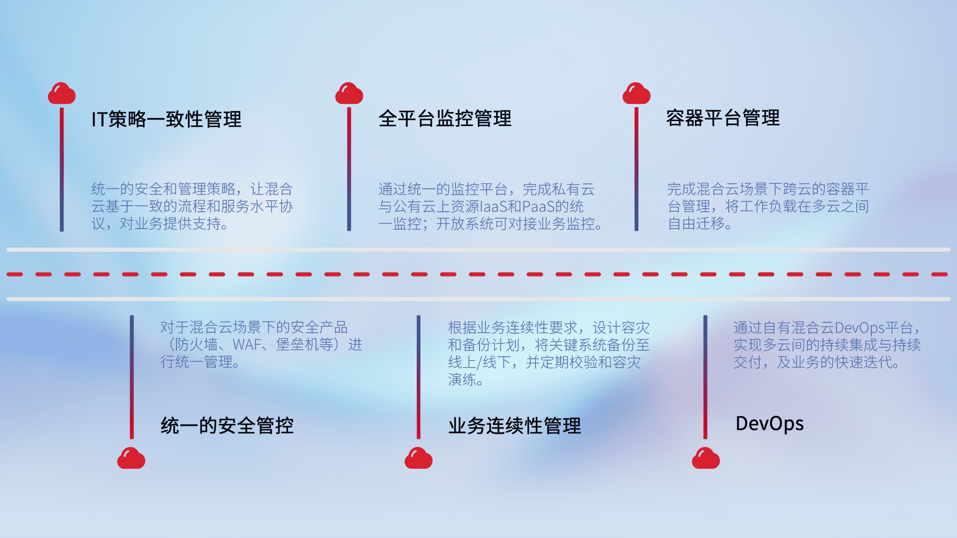 通过多云纳管,,以统一的资源数据模型把客户的云资源进行抽象和封装,,,,进而实现对多云资源的统一操作,,,,保障云资源管理的可靠性、、、、稳定性与可用性。。量身定制化运维内容,,配置、、开发运维、、补丁管理、、备份、、监控、、认证和访问管理、、、、审计和日常巡检等,,,,保障在用云过程中的可靠度,,,,稳定度以及高可用率。。